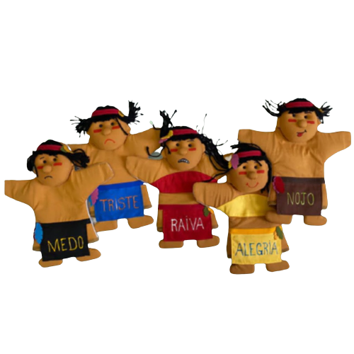 O Kit TEATRO DAS EMOÇÕES contem: - Palco montado medindo 1,75 x 1,0 metros, tendo suporte metálico facilmente desmontável pintado com pintura epóxi branca, com 2 painéis impressão digital 4 cores, 01 placa personalizada com nome da instituição, bolsa para transporte e livro de texto com 03 peças diferentes sobre a cultura Indígena. - 05 Fantoches com braços e pernas representando figuras Indígenas de acordo com cada emoção, sendo elas: Raiva, Alegria, Medo, Nojo e Tristeza.